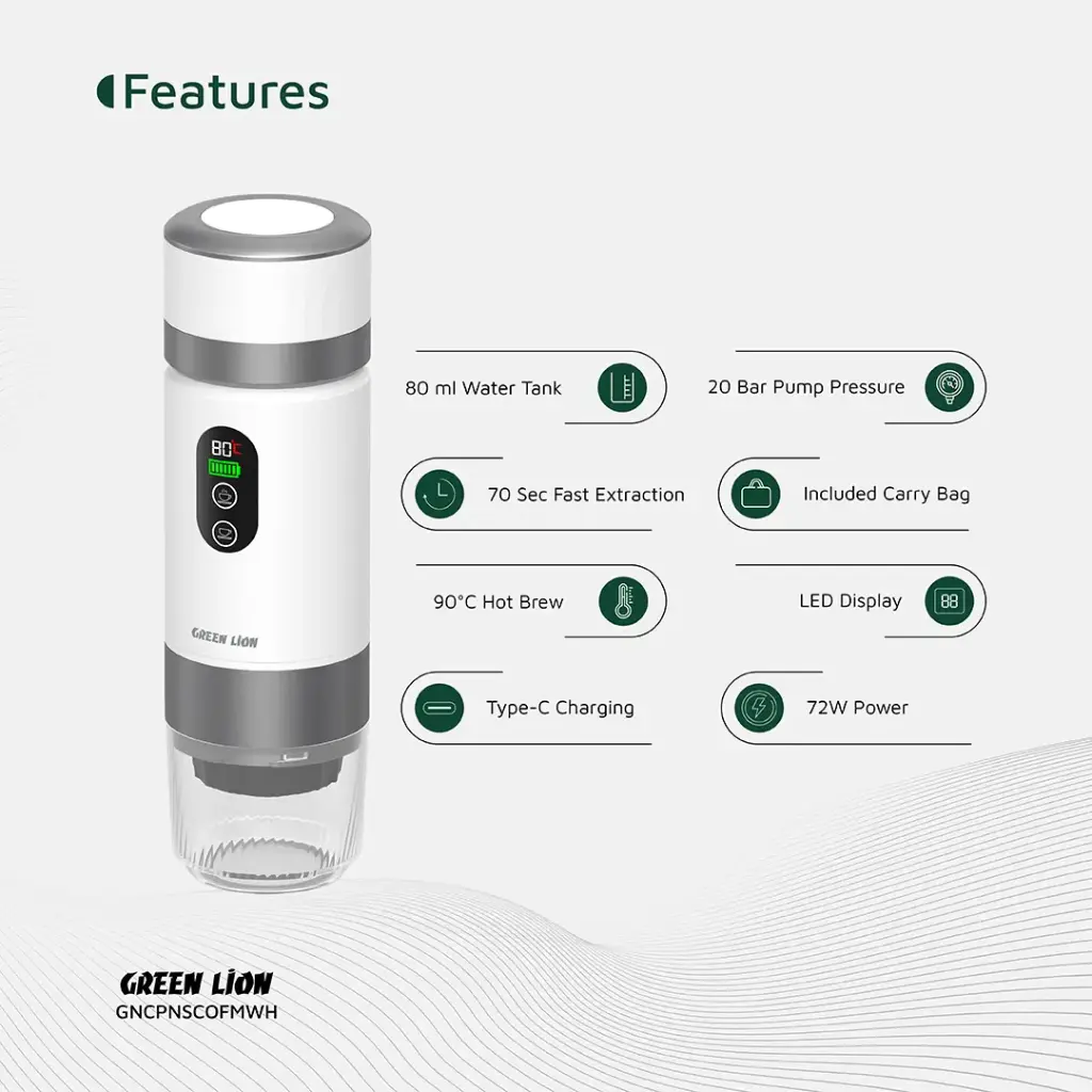 قهوهساز قابل حمل - Green Lion Campinas قهوهساز قابل حمل ایدهآل شما برای قهوه تازه در حال حرکت است. این دستگاه از ABS با کیفیت بالا، فولاد ضد زنگ SUS304 و PC ساخته شده و بادوام و زیبا است. این دستگاه با سه باتری ۲۵۰۰ میلیآمپر ساعتی و خروجی ۷۲ وات و ۱۲ ولت کار میکند و همچنین فرآیند دمآوری کارآمدی را در سفر تضمین میکند. فنجان قهوه کوچک حدود ۱۵۰ میلیلیتر حجم دارد که بر اساس مخزن آب ۸۰ میلیلیتری، ظرفیت ۸ گرم پودر قهوه را دارد، بنابراین میتوانید از طعم غنی اسپرسو لذت ببرید. سیستم فشار پمپ ۲۰ بار - دستگاه اسپرسوساز ELEHOT دارای سیستم فشار ۲۰ بار است تا کرمای غنی و طعم اسپرسوی بینظیر را تضمین کند. المنت گرمایشی تنها در ۶ تا ۱۰ دقیقه به دمای ۹۰ درجه سانتیگراد و زمان استخراج فوری ۷۰ ثانیهای میرسد. شارژ از طریق USB Type-C در عرض ۳ تا ۵ ساعت، نهایت راحتی را برای شما فراهم میکند. یک صفحه نمایش LED تضمین میکند که در طول برنامه دم کردن، از آن مطلع باشید. این دستگاه که با سلیقه شخصی قابل تنظیم است، از دم کردن قهوه سرد تا پنج چرخه پشتیبانی میکند و مجهز به محفظه پودر قهوه و محفظههای کپسول کوچک و بزرگ است. یک کیف حمل شیک به این معنی است که میتوانید قهوه خود را همه جا با خود ببرید.